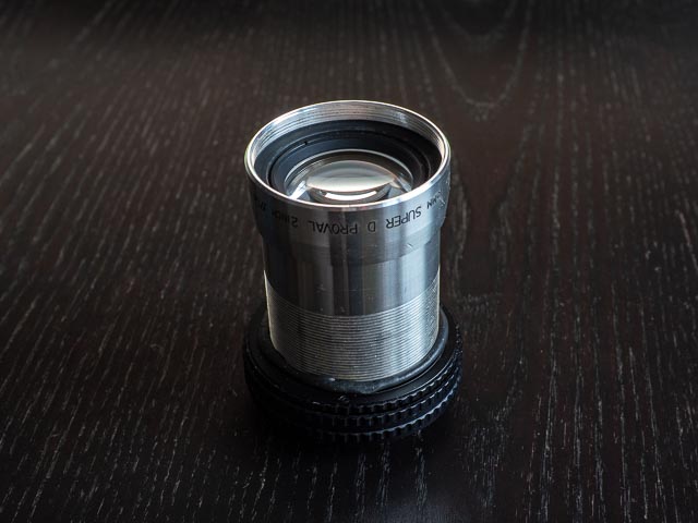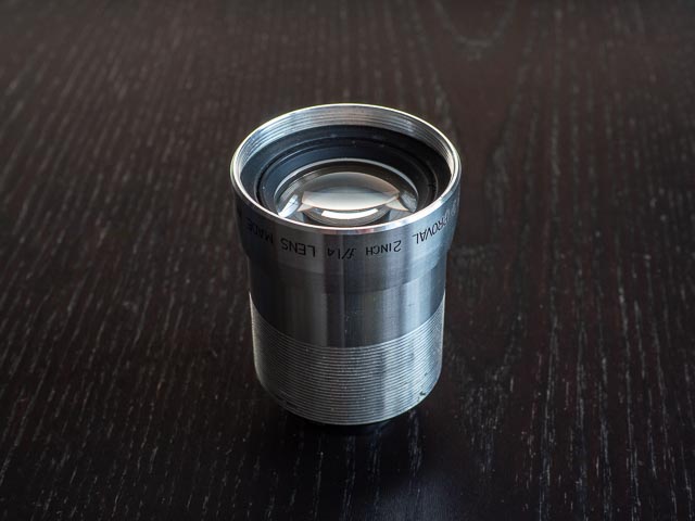 The lens being adapted here is a Bell & Howell Super D Proval 2inch f/1.4 lens from a 16mm cine projector. This lens is very similar to one of my other 16mm cine projector lenses; the Bell & Howell 2 inch/51mm f/1.2. So pretty much everything I wrote about that lens applies to this one too, including the list of things you'll need to mount it on a modern mirrorless digital camera:
