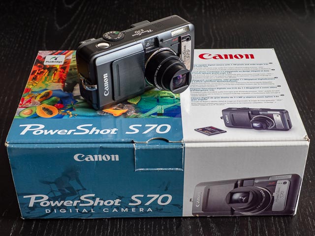 But a short while ago (early November 2025 to be precise) I was just idly browsing eBay (always a dangerous activity for those of us suffering from G.A.S. us camera collectors) when I spotted this S70, boxed and in what looked like good condition, for a reasonable price, so I pressed that buy button before I even knew what I had done! The S70 was the last camera in the PowerShot S line to feature same design language first introduced with the S30 and S40 back in 2001, albeit with a new and rather stylish dark grey colour. So the S70 features the rather industrial design language from the S30/S40, full manual controls, a RAW mode, a compact size, and a nice wide 28-100mm (35mm equiv.) zoom lens… to me that is a highly desirable combination of features.