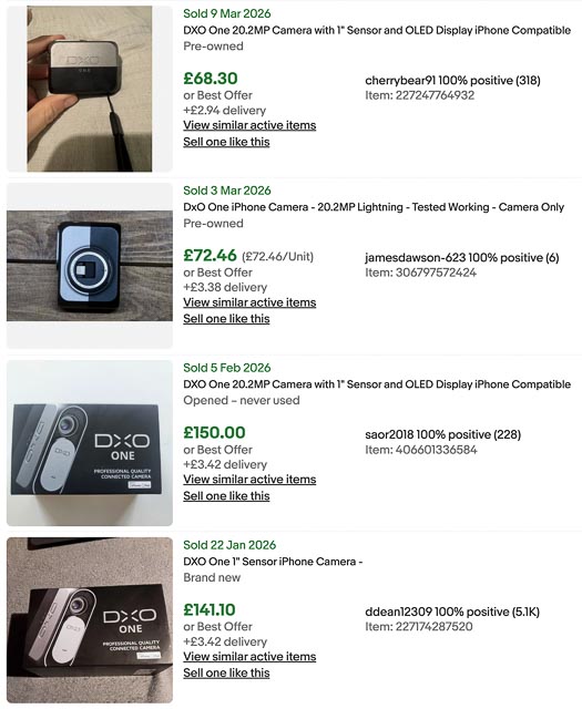 As you can see from this screenshot of an eBay search I carried out on 3 March 2026 for sold listings, you should expect to pay £65-75 for a used DxO One in good working condition, and maybe around £150 for one in new-in-box condition. I actually bought mine from CeX in excellent condition (but without any accessories) for £62 plus £3 p&P. (Hint: on CeX set up an alert if they don't currently have one in stock. That's how I got mine, but I had to wait 2 or 3 months for one to pop up.)